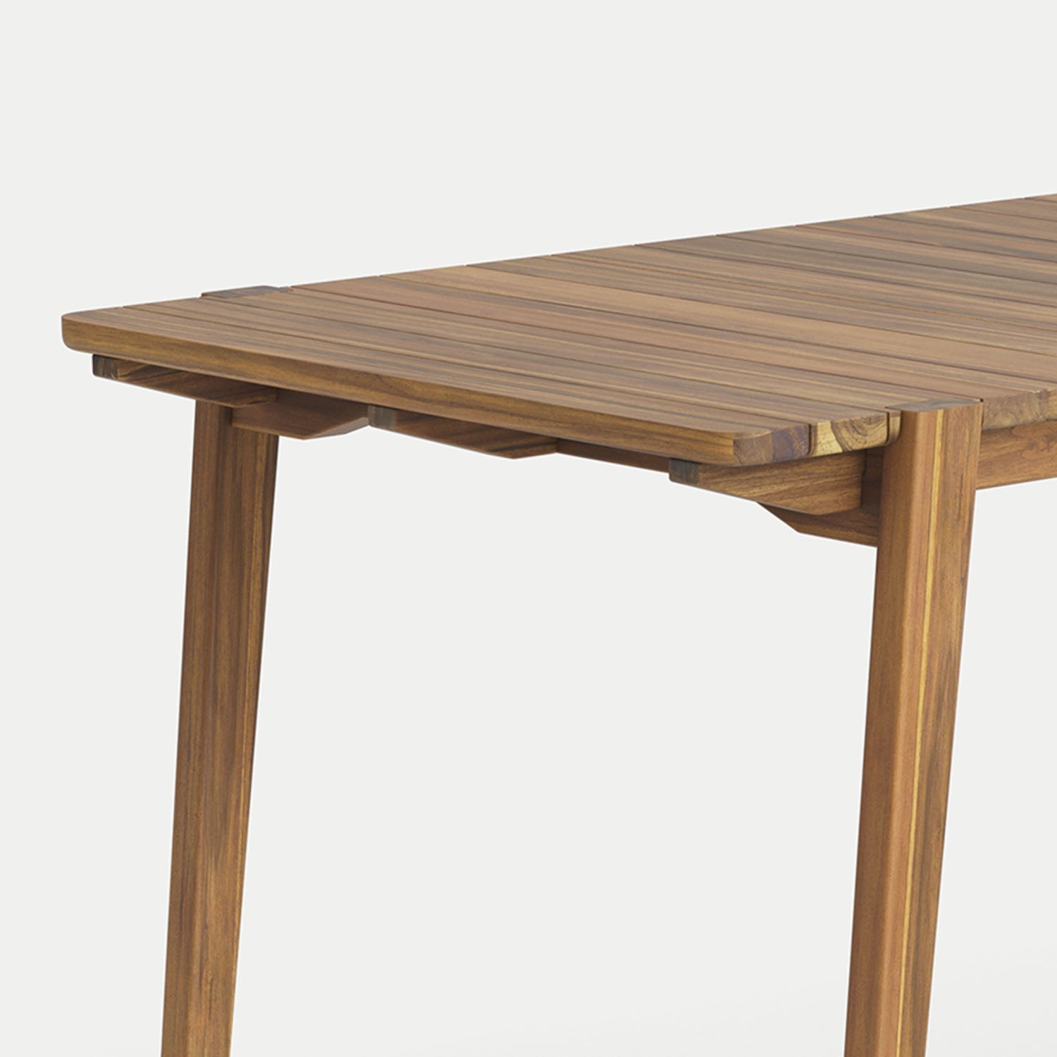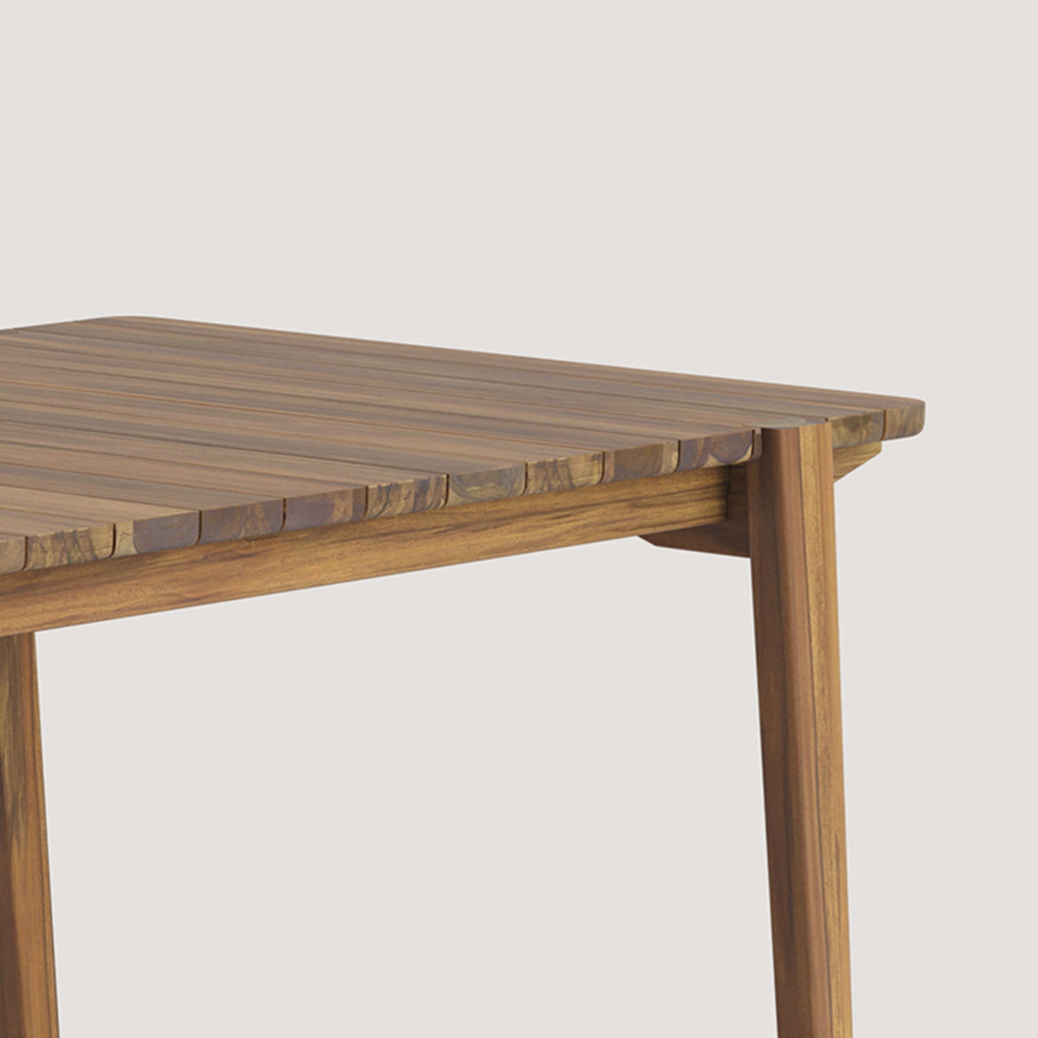 The Apanas Dining Table features a slatted teak wood top, perfect for alfresco dining. Handcrafted from sustainably sourced teak, it’s weather-resistant and ideal for outdoor gatherings.